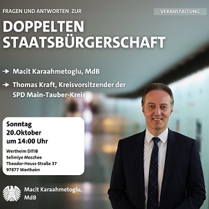 Die Selimiye Moschee Wertheim und die SPD Main-Tauber-Kreis laden Sie herzlich zu einer informativen Veranstaltung ein, bei der wir uns mit dem Thema der doppelten Staatsangehörigkeit befassen und informieren möchten.