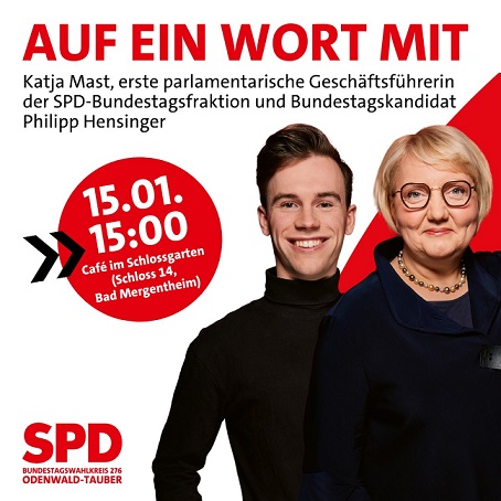 Am Mittwoch, den 15.01.2025, habt ihr die Gelegenheit, mit Katja Mast, der Ersten Parlamentarischen Geschäftsführerin der SPD-Bundestagsfraktion, und Philipp Hensinger, unserem Bundestagskandidaten für Odenwald-Tauber, ins Gespräch zu kommen.