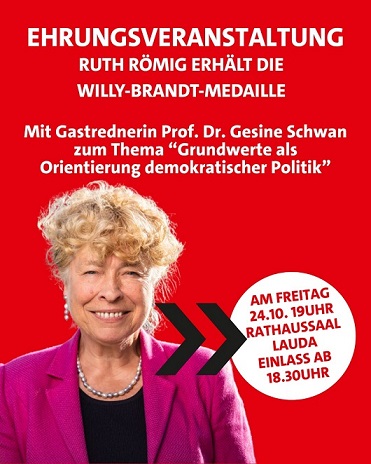 SPD ehrt Frau Ruth Römig In einer öffentlichen Veranstaltung ehrt die SPD Ruth Römig für ihr außerordentliches Engagement und sehr großen Verdienste für die Kommunalpolitk und Lauda-Königshofen. Sie wird die höchste Auszeichnung der Partei, die Willy-Brandt-Medaille, in einer Feierstunde erhalten.